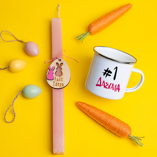 #1 Δασκάλα - Λαμπάδα Με Κούπα Vintage Εμαγιέ Λαμπάδα Με Ξύλινο Στολίδι Και Κούπα Vintage Εμαγιέ