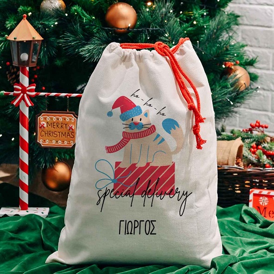 Χριστουγεννιάτικος σάκος από λινό ύφασμα και κόκκινο κορδόνι για τα δώρα σου με σχέδιο ''Cat Special Delivery''. Γράψε το μήνυμα σου δωρεάν και ξεχώρισε!