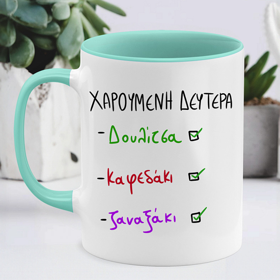 Αναμφισβήτητα η εκτύπωση επάνω σε κούπα αποτελεί την Best Seller κατηγορία μας και αυτό δεν είναι τυχαίο! Διάλεξε την απλή ή μαγική κούπα με σχέδιο "ΧΑΡΟΥΜΕΝΗ ΔΕΥΤΕΡΑ: Δουλίτσα, Καφεδάκι, Ζαναξάκι", απόλαυσε το αγαπημένο σου ρόφημα όπως του αξίζει και βρες αυτή που σου ταιριάζει μέσα από τη μεγάλη ποικιλία χρωμάτων που διαθέτουμε!