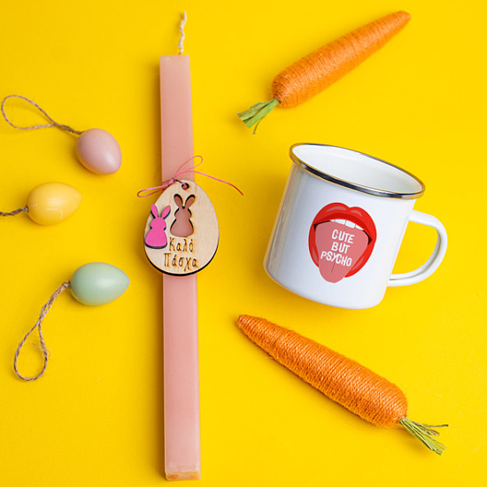 Cute But Psycho - Λαμπάδα Με Κούπα Vintage Εμαγιέ Λαμπάδα Με Ξύλινο Στολίδι Και Κούπα Vintage Εμαγιέ
