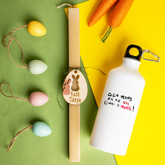 Πακέτο λαμπάδας με αλουμινένιο μπουκάλι νερού μεγάλης χωρητικότητας, έτοιμο να σας κρατήσει δροσερή συντροφιά φέτος στο Πασχαλινό τρέξιμο.