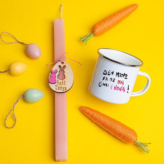 Πακετάκι λαμπάδας για το φετινό πάσχα μαζί με κούπα εμαγιέ, vintage style, όπως μας την μάθανε οι παλιοί.