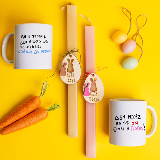 Πασχαλινό πακετάκι για ζευγάρια που θέλουν να κάνουν ανάσταση μαζί φέτος και το επόμενο πρωί να πιούν παρέα τον καφέ τους. Κομψές λαμπάδες συνοδευόμενες από δυο κούπες με ένα από τα πιο γλυκά σχέδια για ζευγαράκια.