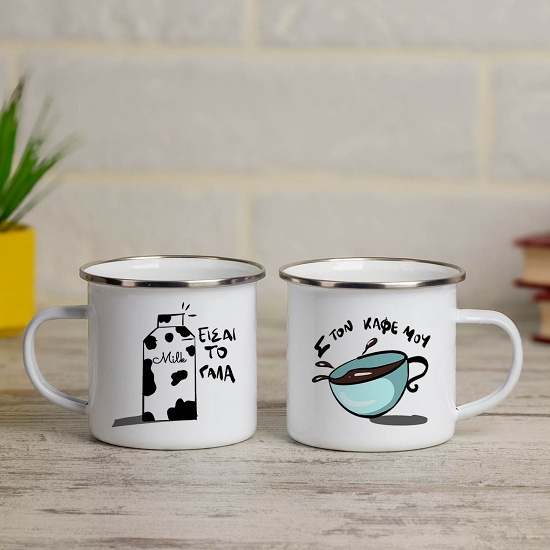 Διάλεξε δύο κούπες vintage εμαγιέ με σχέδιο  '' Είσαι το γάλα ... στον καφέ μου ''  μία για εσένα και μία για τον αγαπημένο σου.