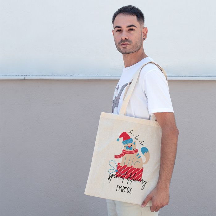 Υφασμάτινη οικολογική τσάντα με μακριά χερούλια και σχέδιο  ''Cat Special Delivery''. Γράψε το μήνυμα σου δωρεάν και ξεχώρισε!  Μπορεί να σου φανεί χρήσιμη στην βόλτα ή και στα καθημερινά σου ψώνια. Προσωποποίησε την με κείμενο ή σχέδιο της δική σου επιλογής και διαμόρφωσε την σύμφωνα με το δικό σου προσωπικό στυλ! Ένα πολύ χαριτωμένο και χρήσιμο δώρο για όλες τις ηλικίες και όλα τα γούστα!