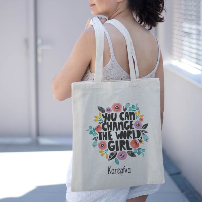 Yφασμάτινη οικολογική τσάντα με μακριά χερούλια Μπορεί να σου φανεί χρήσιμη στην βόλτα ή και στα καθημερινά σου ψώνια. Προσωποποίησε την με κείμενο ή σχέδιο της δική σου επιλογής και διαμόρφωσε την σύμφωνα με το δικό σου προσωπικό στυλ! Ένα πολύ χαριτωμένο και χρήσιμο δώρο για όλες τις ηλικίες και όλα τα γούστα!
