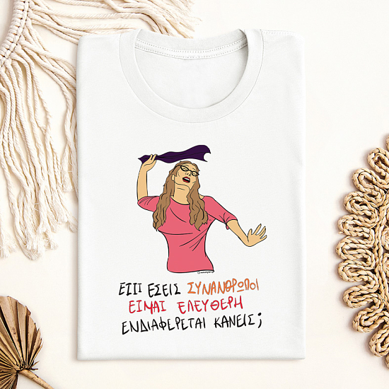T-shirts από vegan οργανικό βαμβάκι με την ατάκα "ΕΙΙΙ ΕΣΕΙΣ ΣΥΝΑΝΘΡΩΠΟΙ ΕΙΜΑΙ ΕΛΕΥΘΕΡΗ ΕΝΔΙΑΦΕΡΕΤΑΙ ΚΑΝΕΙΣ;".