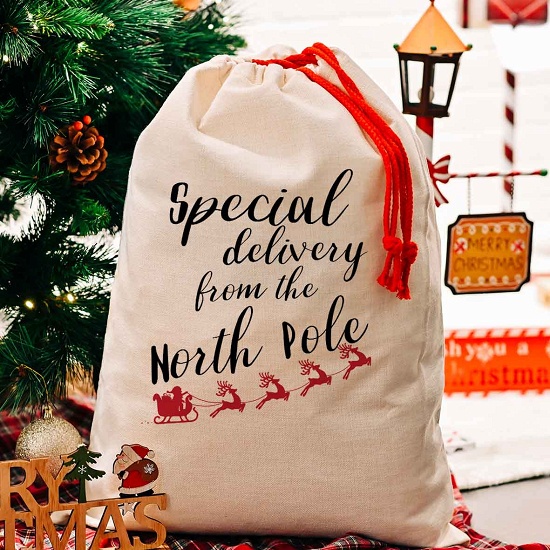 Χριστουγεννιάτικος σάκος από λινό ύφασμα και κόκκινο κορδόνι για τα δώρα σου με σχέδιο ''Special Delivery from the North Pole''. Γράψε το μήνυμα σου δωρεάν και ξεχώρισε!