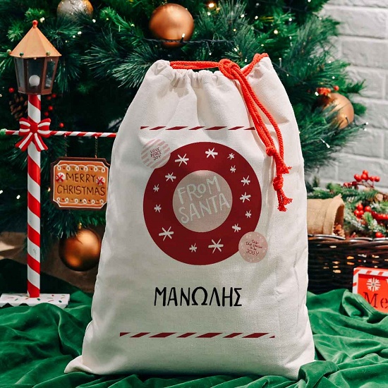 Χριστουγεννιάτικος σάκος από λινό ύφασμα και κόκκινο κορδόνι για τα δώρα σου με σχέδιο ''From Santa''. Γράψε το μήνυμα σου δωρεάν και ξεχώρισε!