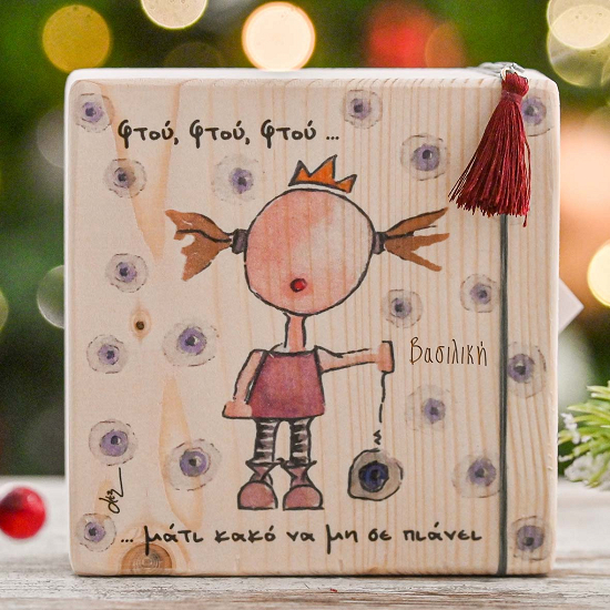 Ξύλινο χειροποίητο γούρι με την φιγούρα ενός μικρού κοριτσιού και την φράση ''Φτου, φτου, Μάτι Κακό να μην σε Πιάνει''.