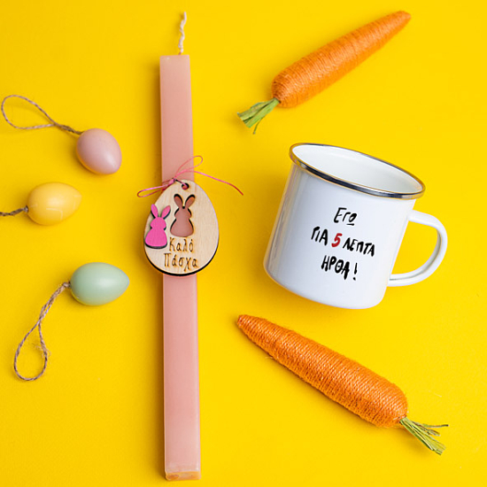 Πακετάκι λαμπάδας για το φετινό πάσχα μαζί με κούπα εμαγιέ, vintage style, όπως μας την μάθανε οι παλιοί.