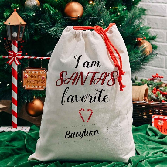 Χριστουγεννιάτικος σάκος από λινό ύφασμα και κόκκινο κορδόνι για τα δώρα σου με σχέδιο ''I am Santa's favorite''. Γράψε το μήνυμα σου δωρεάν και ξεχώρισε!