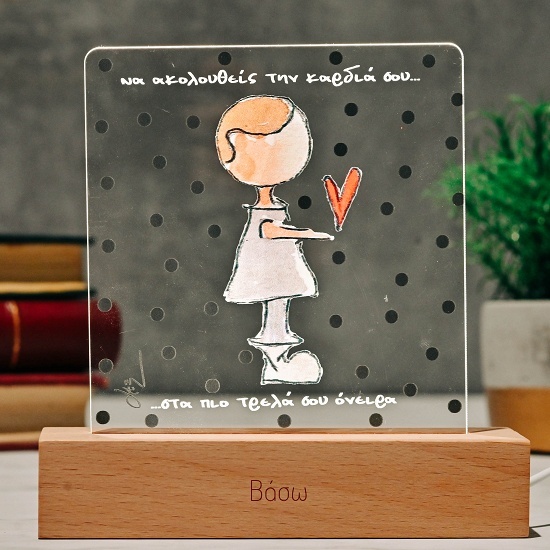 Επιτραπέζιο, χειροποίητο φωτιστικό με ξύλινη βάση led και εκτύπωση σε plexi glass με σχέδιο την φιγούρα ενός αγοριού και την φράση ''Να ακολουθείς την καρδιά σου στα πιο τρελά σου όνειρα'' .