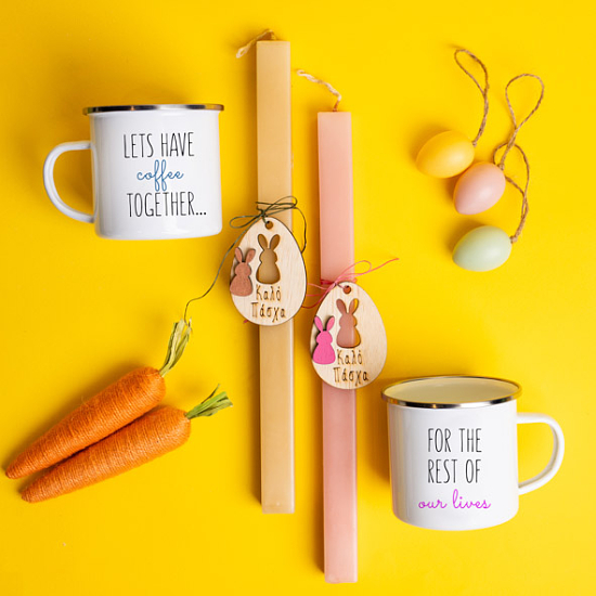 Πασχαλινό πακετάκι για ζευγάρια που θέλουν να κάνουν ανάσταση μαζί φέτος και το επόμενο πρωί να πιούν παρέα τον καφέ τους. Κομψές λαμπάδες συνοδευόμενες από δυο κούπες εμαγίε.