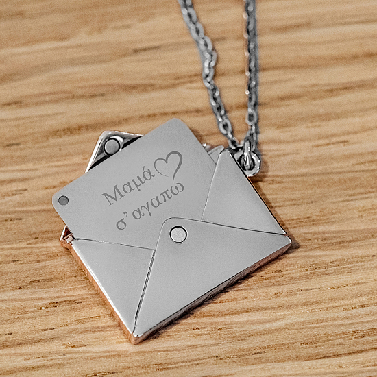 Ένα ιδιαίτερο μενταγιόν σε σχήμα Love Letter το οποίο ανοίγει και τοποθετείται η πλακέτα με αφιέρωση "Μαμά σ' αγαπώ". Η αλυσίδα είναι κατασκευασμένη από αλουμίνιο ενώ το στοιχείο από καθαρό ανοξείδωτο ατσάλι.