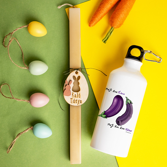 Πακέτο λαμπάδας με αλουμινένιο μπουκάλι νερού μεγάλης χωρητικότητας, έτοιμο να σας κρατήσει δροσερή συντροφιά φέτος στο Πασχαλινό τρέξιμο.