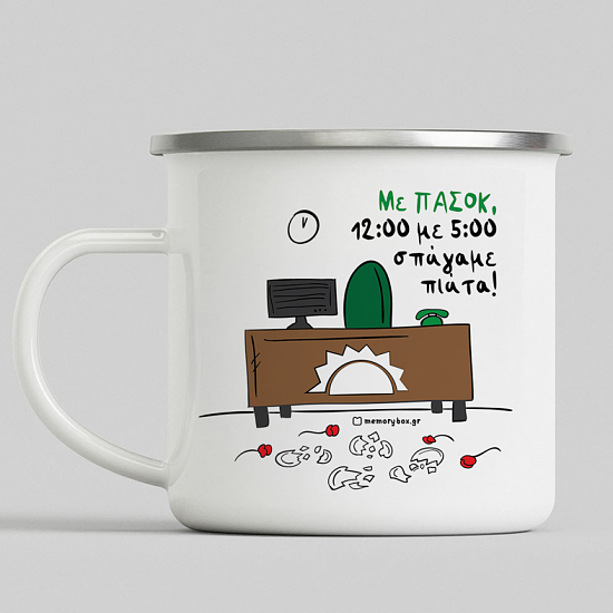 Διάλεξε την κούπα vintage εμαγιέ με σχέδιο "Με ΠΑΣΟΚ, 12:00 με 5:00 σπάγαμε πιάτα!" και θα δεις ότι η ανθεκτικότητα της αλλά και το σχέδιο που θα διαλέξεις θα σε συντροφεύει για πολλά χρόνια. Το αγαπημένο σου ρόφημα αξίζει να έχει μια κούπα με στυλ!