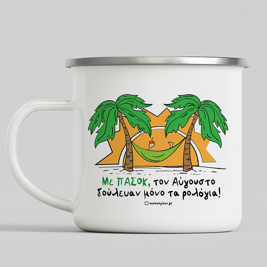Διάλεξε την κούπα vintage εμαγιέ με σχέδιο "Με ΠΑΣΟΚ, τον Αύγουστο δούλευαν μόνο τα ρολόγια" και θα δεις ότι η ανθεκτικότητα της αλλά και το σχέδιο που θα διαλέξεις θα σε συντροφεύει για πολλά χρόνια. Το αγαπημένο σου ρόφημα αξίζει να έχει μια κούπα με στυλ!