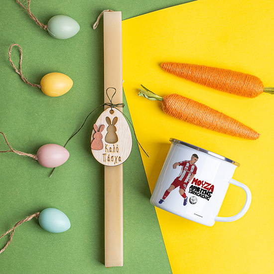 Πακετάκι λαμπάδας για το φετινό πάσχα μαζί με κούπα εμαγιέ, vintage style, όπως μας την μάθανε οι παλιοί.