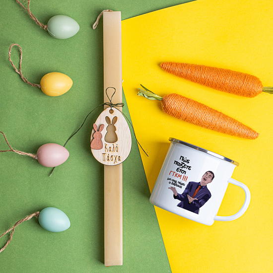 Πακετάκι λαμπάδας για το φετινό πάσχα μαζί με κούπα εμαγιέ, vintage style, όπως μας την μάθανε οι παλιοί.