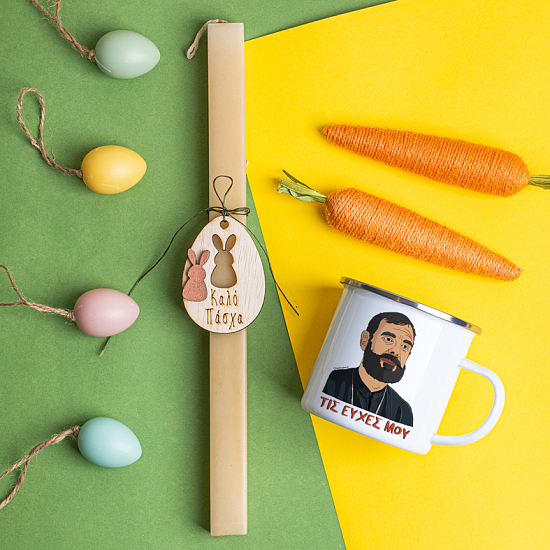 Πακετάκι λαμπάδας για το φετινό πάσχα μαζί με κούπα εμαγιέ, vintage style, όπως μας την μάθανε οι παλιοί.