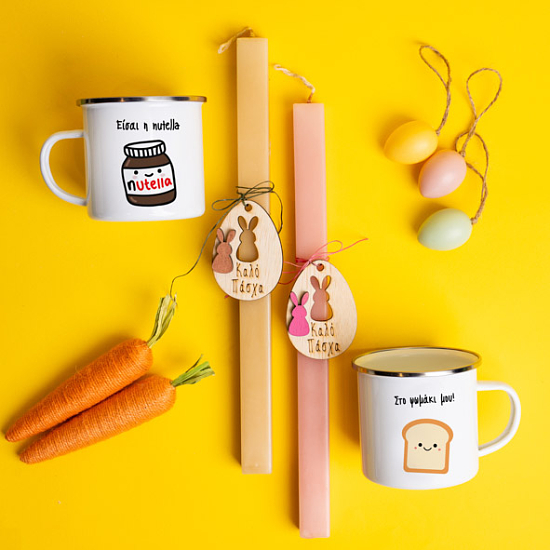 Nutella & Ψωμάκι - Λαμπάδες Με Κούπες Vintage Εμαγιέ Δύο Λαμπάδες Με Ξύλινο Στολίδι Και Δύο Κούπες Vintage Εμαγιέ