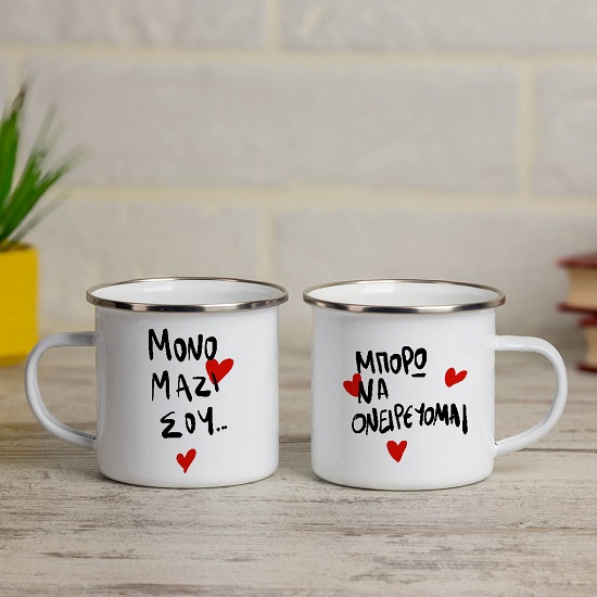 Διάλεξε δύο κούπες vintage εμαγιέ με σχέδιο  '' Μόνο μαζί σου... μπορώ να ονειρεύομαι  ''  μία για εσένα και μία για τον αγαπημένο σου.