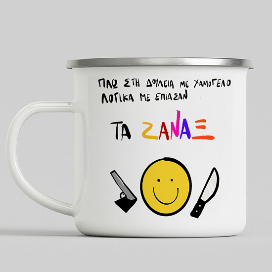 Διάλεξε την κούπα vintage εμαγιέ με σχέδιο "ΠΑΩ ΣΤΗ ΔΟΥΛΕΙΑ ΜΕ ΧΑΜΟΓΕΛΟ, ΛΟΓΙΚΑ ΜΕ ΕΠΙΑΣΑΝ ΤΑ ΖΑΝΑΞ" και θα δεις ότι η ανθεκτικότητα της αλλά και το σχέδιο που θα διαλέξεις θα σε συντροφεύει για πολλά χρόνια. Το αγαπημένο σου ρόφημα αξίζει να έχει μια κούπα με στυλ!