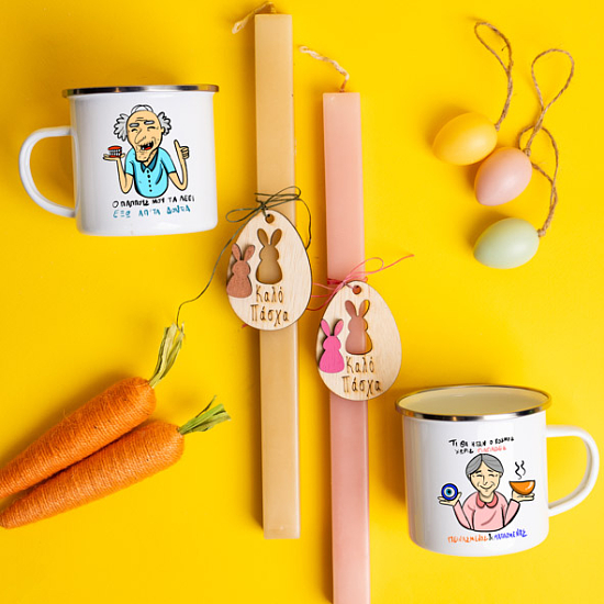 Πασχαλινό πακετάκι για ζευγάρια που θέλουν να κάνουν ανάσταση μαζί φέτος και το επόμενο πρωί να πιούν παρέα τον καφέ τους. Κομψές λαμπάδες συνοδευόμενες από δυο κούπες εμαγίε.