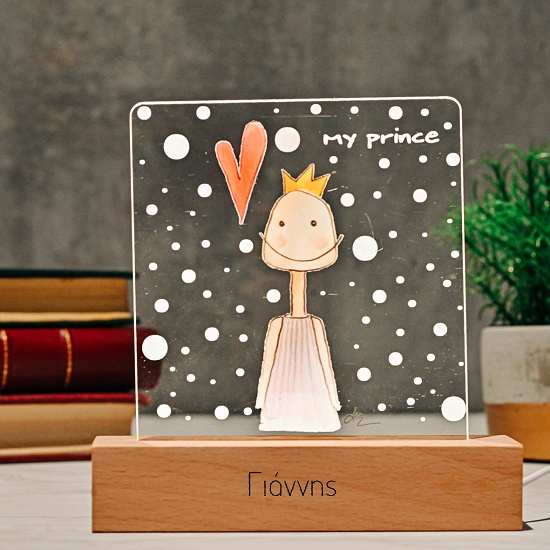 Επιτραπέζιο, χειροποίητο φωτιστικό με ξύλινη βάση led και εκτύπωση σε plexi glass με την φιγούρα ενός αγοριού και την φράση ''My Prince''.