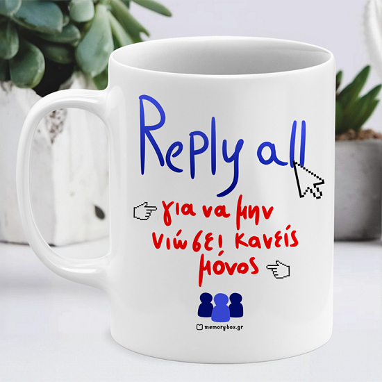Αναμφισβήτητα η εκτύπωση επάνω σε κούπα αποτελεί την Best Seller κατηγορία μας και αυτό δεν είναι τυχαίο! Διάλεξε την απλή ή μαγική κούπα με σχέδιο " Reply All ", απόλαυσε το αγαπημένο σου ρόφημα όπως του αξίζει και βρες αυτή που σου ταιριάζει μέσα από τη μεγάλη ποικιλία χρωμάτων που διαθέτουμε!