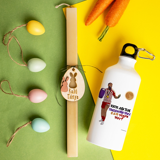 Πακέτο λαμπάδας με αλουμινένιο μπουκάλι νερού μεγάλης χωρητικότητας, έτοιμο να σας κρατήσει δροσερή συντροφιά φέτος στο Πασχαλινό τρέξιμο.