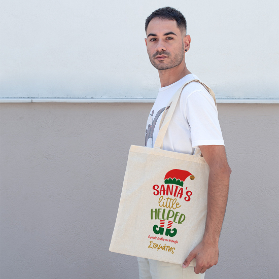 Υφασμάτινη οικολογική τσάντα με μακριά χερούλια και σχέδιο "Santa's Little Helper". Γράψε το μήνυμα σου δωρεάν και ξεχώρισε!