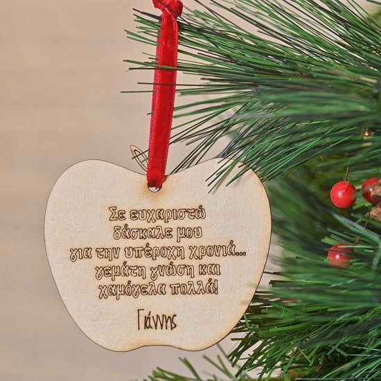 Ένα κρεμαστό ξύλινο στολίδι σε σχήμα μήλου με χαραγμένη την φράση ''Σε ευχαριστώ δάσκαλε μου για την υπέροχη χρονιά... γεμάτη γνώση και χαμόγελα πολλά! '' και βελούδινη κόκκινη κορδέλα .