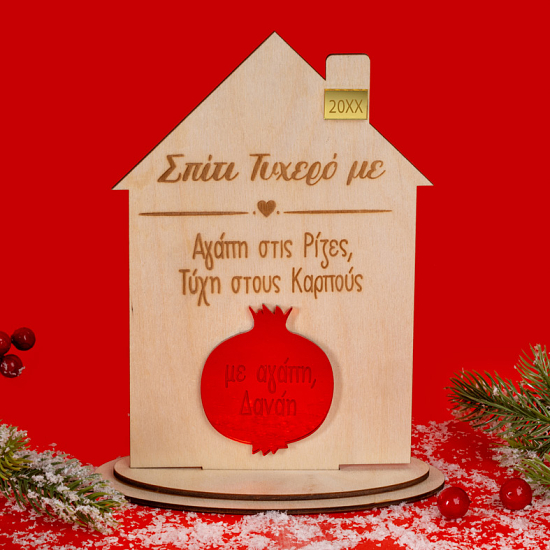 Το Σπίτι Τυχερό είναι φτιαγμένο από φυσικό ξύλο σημύδας και συνδυάζει τη ζεστασιά της ξυλογλυπτικής με τη μοντέρνα λεπτομέρεια πλέξι γκλας. Το κόκκινο ρόδι, σύμβολο καλής τύχης και αφθονίας, χαρίζει έντονη χρωματική πινελιά, ενώ το πλέξι γκλας με τη χρονολογία προσθέτει μια ιδιαίτερη, γιορτινή αίσθηση.