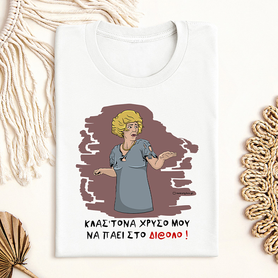 T-shirts από vegan οργανικό βαμβάκι με την ατάκα "ΚΛΑΣ'ΤΟΝΑ ΧΡΥΣΟ ΜΟΥ ΝΑ ΠΑΕΙ ΣΤΟ ΔΙ@ΛΟ!".