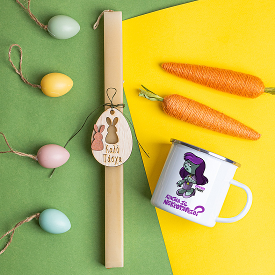 Πακετάκι λαμπάδας για το φετινό πάσχα μαζί με κούπα εμαγιέ, vintage style, όπως μας την μάθανε οι παλιοί.