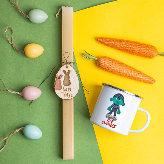 Πακετάκι λαμπάδας για το φετινό πάσχα μαζί με κούπα εμαγιέ, vintage style, όπως μας την μάθανε οι παλιοί.