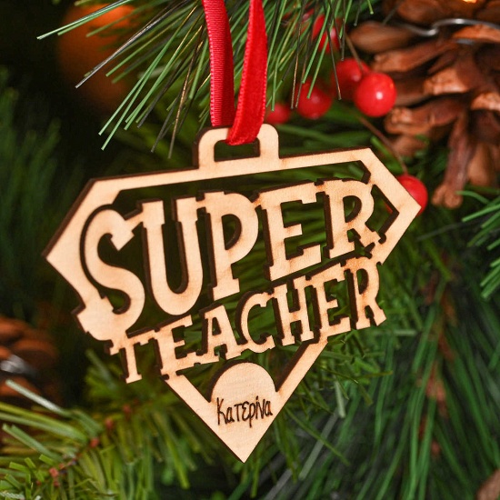 Χειροποίητο κρεμαστό ξύλινο στολίδι με διάτρητη την φράση ''Super Teacher '' και βελούδινη κόκκινη κορδέλα . Γράψε το όνομα του δασκάλου σου και χάρισε του ένα μοναδικό στολίδι για το δένδρο!