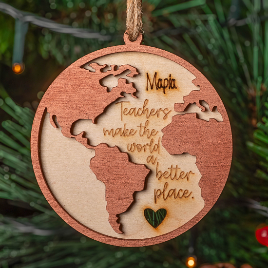 Χειροποίητο κρεμαστό ξύλινο στολίδι σε χάρτη με το μήνυμα <Teachers make the wolrd a better place> .