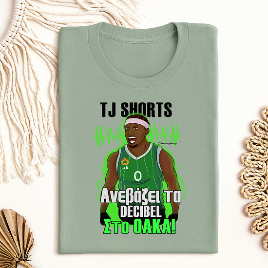 T-shirts από vegan οργανικό βαμβάκι με την ατάκα "TJ SHORTS Ανεβάζει τα DECIBEL ΣΤΟ ΟΑΚΑ".