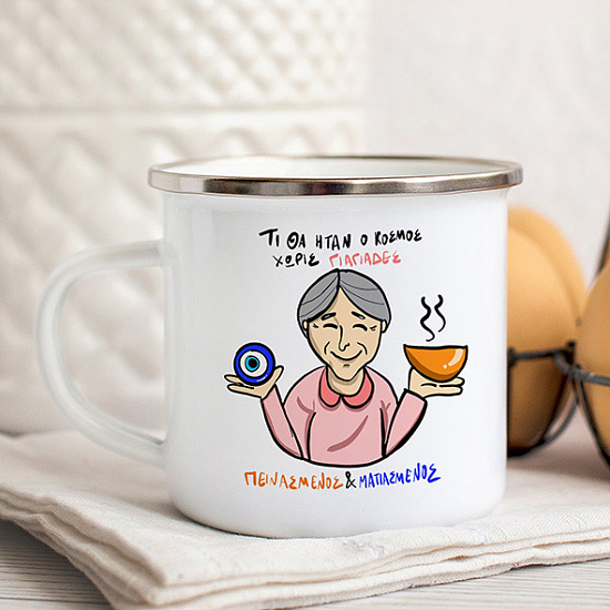 Διάλεξε την κούπα vintage εμαγιέ με σχέδιο "Το ξεμάτιασμα της γιαγιάς!" και θα δεις ότι η ανθεκτικότητα της αλλά και το σχέδιο που θα διαλέξεις θα σε συντροφεύει για πολλά χρόνια.