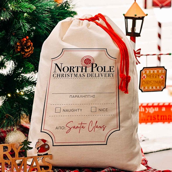Χριστουγεννιάτικος σάκος από λινό ύφασμα και κόκκινο κορδόνι για τα δώρα σου με σχέδιο ''North Pole Christmas Delivery''. Γράψε το όνομα σου δωρεάν και ξεχώρισε!
