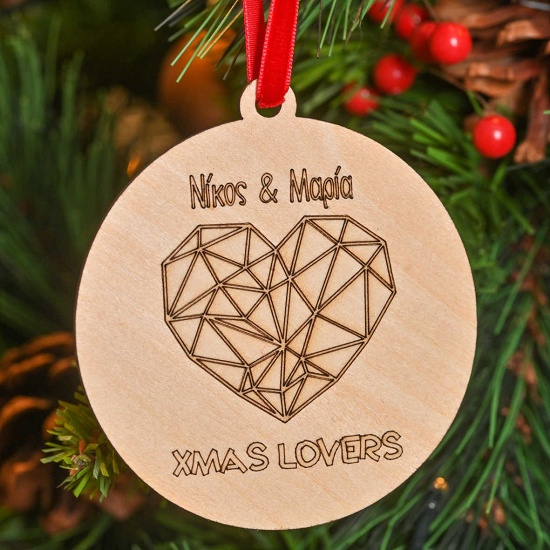 Ένα κρεμαστό ξύλινο στολίδι με χαραγμένη μία καρδιά και την φράση '' Xmas Lovers '' και βελούδινη κόκκινη κορδέλα .