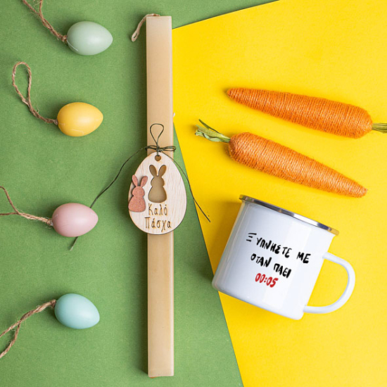 Πακετάκι λαμπάδας για το φετινό πάσχα μαζί με κούπα εμαγιέ, vintage style, όπως μας την μάθανε οι παλιοί.